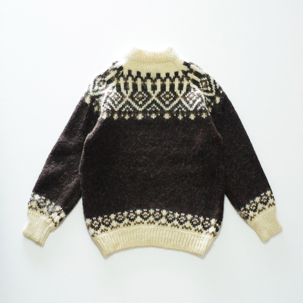深いブラウンとアイボリーのクラシックな柄編みがかわいい一着。